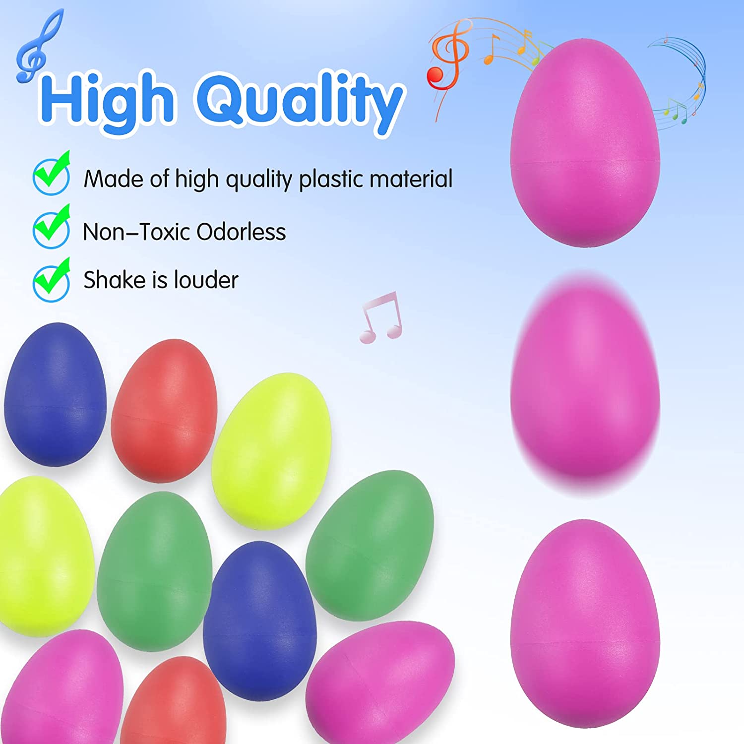 Plastic egg shakers They are made of high quality plastic material, non-toxic, 100% odor free, lightweight, shake louder, durable and fun.