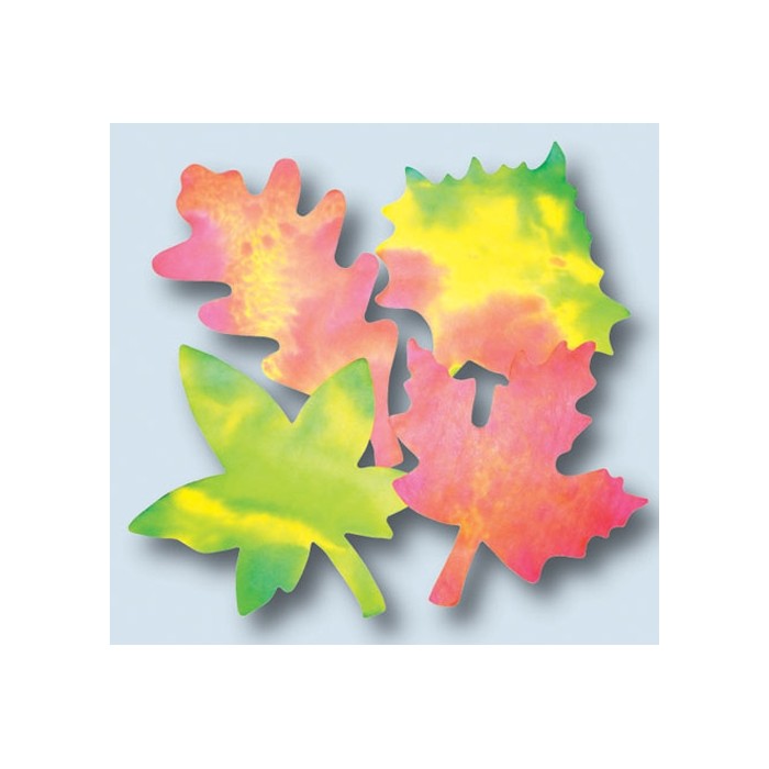 Four large leaf shapes cut from Colour Diffusing Paper. Squirt, spray and splatter intense liquid water colour over the leaves. Mist with water and watch as the paint swirls and mixes to create fantastic patterns of colour! Leaves measure up to 23cm x 18cm (9" x 7 1/4"). Idea guide also included. Ages five and up.