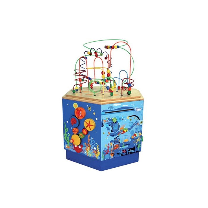 The Hape Coral Reef Activity Center has lots of levers, dials, cranks and maze activities to create an exciting hands-on ocean theme environment for public play spaces. Each of the 6 sides has opportunity for play: The turtle maze challenges children to use both hands or race with someone else and see who can move the little turtle to the top of the big turtle's shell first. The wheel panel allows you to turn the knob on the big yellow disc and discover how some dials move faster than others. Pull the boat across the water and watch it speed by. Push the fish dial down and see what ocean critter is hiding on the other side. Match the whimsical marine animals with their families. Children turn the green knob on the fish's face and make the eyes twirl. Children can get a close-up view of themselves in the mirrored diving helmet. The Coral Reef Activity Center ships with the bead and wire maze inverted into the base. Simply install the maze on the base by tightening the screws. Measures: 29.72" x 25.73" x 35.04"; Wipe clean with damp cloth. The Hape Coral Reef Activity Center has lots of levers, dials, cranks and maze activities to create an exciting hands-on ocean theme environment for public play spaces. Each of the 6 sides has opportunity for play: The turtle maze challenges children to use both hands or race with someone else and see who can move the little turtle to the top of the big turtle's shell first. The wheel panel allows you to turn the knob on the big yellow disc and discover how some dials move faster than others. Pull the boat across the water and watch it speed by. Push the fish dial down and see what ocean critter is hiding on the other side. Match the whimsical marine animals with their families. Children turn the green knob on the fish's face and make the eyes twirl. Children can get a close-up view of themselves in the mirrored diving helmet. The Coral Reef Activity Center ships with the bead and wire maze inverted into the base. Simply install the maze on the base by tightening the screws. Measures: 29.72" x 25.73" x 35.04"; Wipe clean with damp cloth.