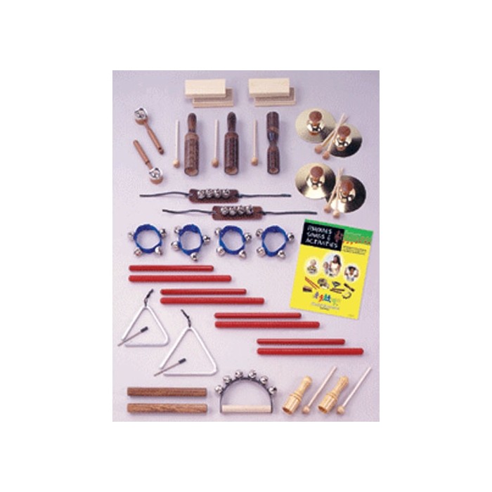 Our Rhythm Instrument Sets include an assortment of instrument combinations, ideal for accommodating different numbers of players in a classroom. Each set has been carefully selected to provide a wide range of rhythm, timbre and pitch. Includes an Instructor's Book and a handy corrugated storage box with a built-in handle. Ages 3 and up. Set Includes: 2 Pair Blocks, 2 Single Jingle Taps, 2 Crow Sounders, 1 Two-Tone Wood Block, 2 Cymbals w/Mallets Pair, 2 Ankle Bells, 4 Wrist Bells, 4 Rhythm Sticks Pair, 1 Triangle, 1 Triangle, 1 Hardwood Claves Pair, 1 Handle Sleigh Bells, 2 Soprano Sounders, 1 Rhythms, Rhymes & Songs Instructor's Book.
