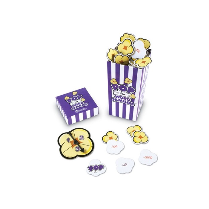 Pull out a popcorn piece and create a word with that ending. A POP kernel means all your pieces go back! Start with 2-letter endings, then move up to 3-letter endings and rhyming practice. Includes 92 blend cards, 8 POP cards, spinner and guide. For 2 4 players Popcorn box measures 3 L x 3 W x 6.25 H Grades 1+