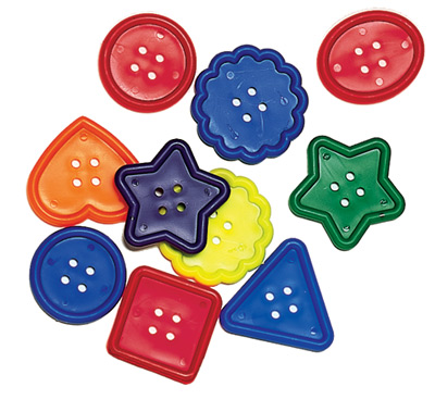 Perfect for preschool art projects! Really Big Buttons™ are super for stringing. Eight primary shapes and bright colors. 2 x 2” (5 cm). 1 lb (454 g).