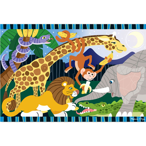 Take an exciting journey into the jungle with the Melissa and Doug Safari Social Floor Puzzle. Captivate young imaginations with favourite safari animals including a giraffe, elephant, monkey and more! This colourful floor puzzle has 24 durable pieces that are 20% thicker than regular cardboard puzzle pieces. An easy-clean surface also keeps this puzzle looking new longer. The Melissa and Doug Safari Social Floor Puzzle makes a great first floor puzzle for young adventurers ages three and up.