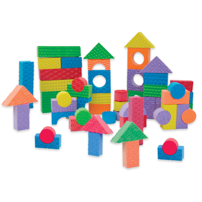 Safe, Soft durable textured foam blocks assorted sizes, colors and shapes. Great product for building, stamping and stimulates touch senses with surface textures. Set includes: 80 assorted block shapes and sizes, colors include Red, Yellow, Blue, Green, Purple and more. Blocks are 1" thick (2.2 cm).