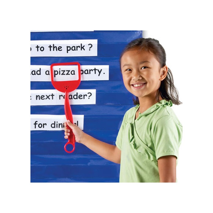 Set of 4 word frames used to point out (swat) specific words. Used with words on a pocket chart, word wall of board. Resembles a fly swatter with a hole in the centre. Each swatter has a different sized hole. K to Gr. 3.