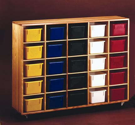 Complete with 25 strong plastic bins in assorted colors. Swivel castors add mobility. Birch Plywood 48" x38" Hx12"D.