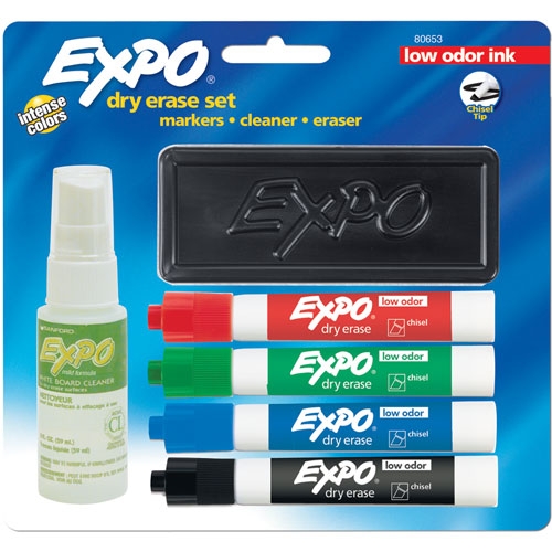 Kit includes an eraser, 2 oz. bottle of cleaner and a set of 4 low-odour chisel top markers, one each of black, red, green and blue.