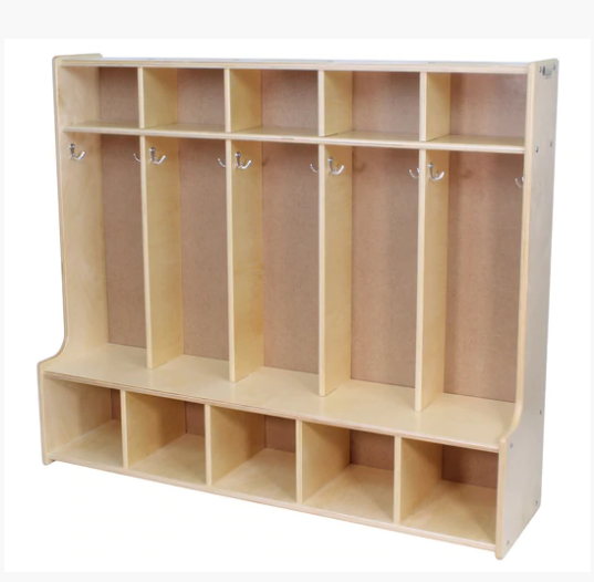Keep your classroom or home organized with our Contender 5 Section Seat Locker. This child safe locker provides a preschooler a spot to sit and store their belongings; each locker is fitted with dual double-sided hanger that offers them a place to hang their coats and backpacks. Additionally, there are two smaller cubbies above and below each section for their lunchboxes and shoes. The open access design provides easy access and visibility for their personal items and the natural finish is perfect for any classroom or home décor. Constructed from 100% Baltic Birch plywood with eased edges and coated with our exclusive Tuff-Gloss™ UV Finish making it resistant to stains and durable for any active environments. This product is GREENGUARD® Gold certified for non-toxic emissions and air quality.