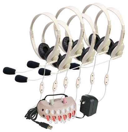 Introducing the first multi-modal jackbox which is capable of recording verbal responses in addition to playing audio. When connecting up to six microphones, the jackbox transfers students' answers through its USB plug to the connected computer, where their answers can be stored and replayed from. The USB jackbox doubles the effectiveness of language learning with speech utilization, making it ideal for students of all ages as well as for multiple users on a VOIP call.