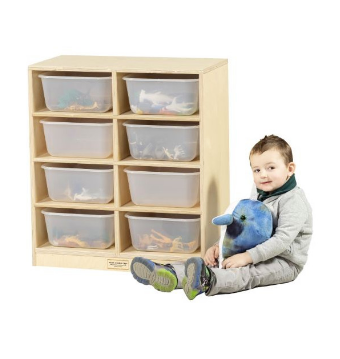 Made of 3/4″ baltic birch. This unit offers 8 compartments which have 8 translucent totes for storage in the classroom. Has 2 locking and 2 non locking casters. A kick plate has been placed on the front to hide casters. Unit comes fully assembled. For toddlers or school age. Ages 9 months +.
