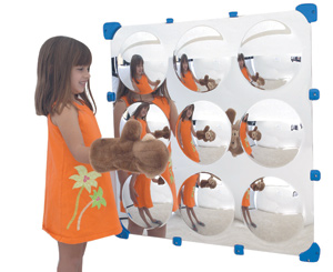 9 Bubble Maxi Mirror. 9 convex mirror bubbles surrounded by flat reflections of all that is seeable. Our polyethylene fittings attach to flat surfaces. Hardware not included. 32"l x 32"w