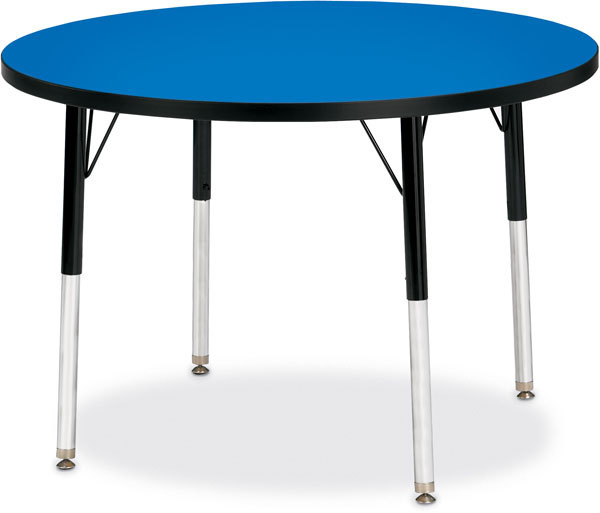Activity Table 36" Round Laminate Tabletop Adjustable height. Nylon-based swivel glides.Blue, Red and Yellow tables come with a black t-mldg edge. Country Maple tables are sold with a matching Country Maple or Black t-mldg edge. Tables come with easy to mount adjustable legs heights. Legs adjust in one-inch increments.