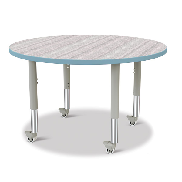 These round tables are excellent for allowing children to interact with each other during projects. Accommodates up to 6 chairs. The legs adjust from 20” to 31” high, are 2” thick, and feature heavy-duty casters. Driftwood Gray tabletop with Coastal Blue TRUEdge, gray legs, and gray casters.