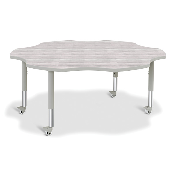 Perfect seating area for any early learning space. Accommodates up to 6 chairs. The legs adjust from 20” to 31” high, are 2” thick, and feature heavy-duty casters. Driftwood Gray tabletop with Gray TRUEdge, gray legs, and gray casters.