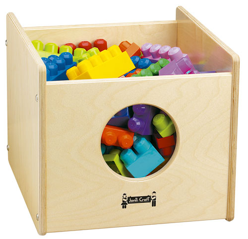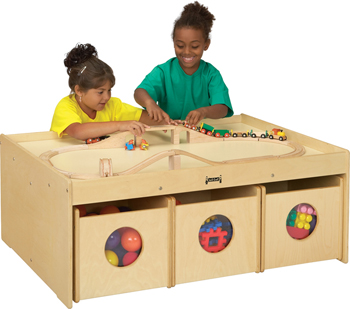 Large 32½" wide by 43" long play surface provides ample play space. Includes six See-n-Wheel storage bins (three on each side) for convenient storage of large toys. One and a half inch lip around the outside edge keeps parts on the table and off the floor. Table top is 16" high. 34" wide x 44" long x 17½" high.