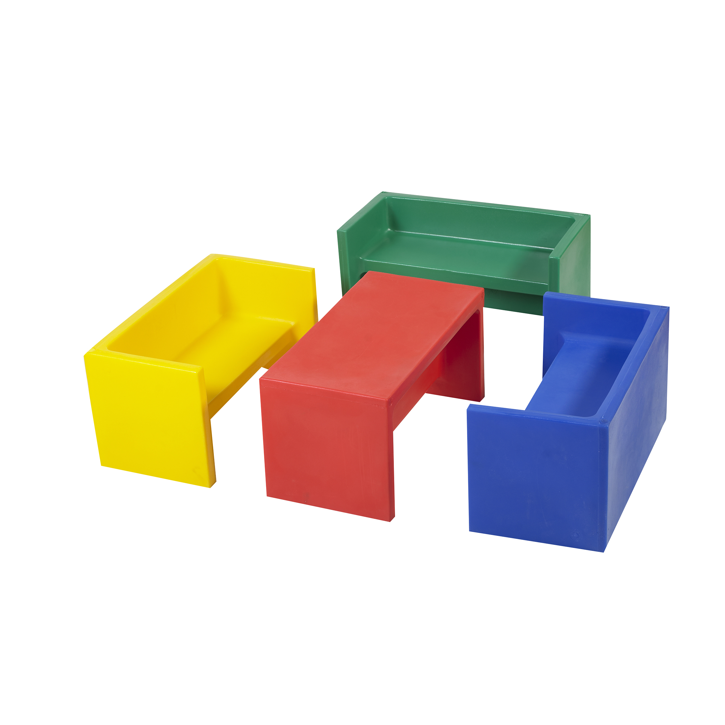 Discover the hidden versatility! This bright and versatile Adapta-Bench has three uses in one! First, use it as a sofa with either a 7″ or a 9″ high seat. Then flip it over and use it as a table or seat for adults.