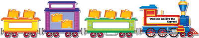 All Aboard! Bulletin Board Set Set features 6 train cars, 30 student suitcases and railroad/road sign. Fully assembled- 15.5"x72.5". 37 pieces. Grade: ALL AGES