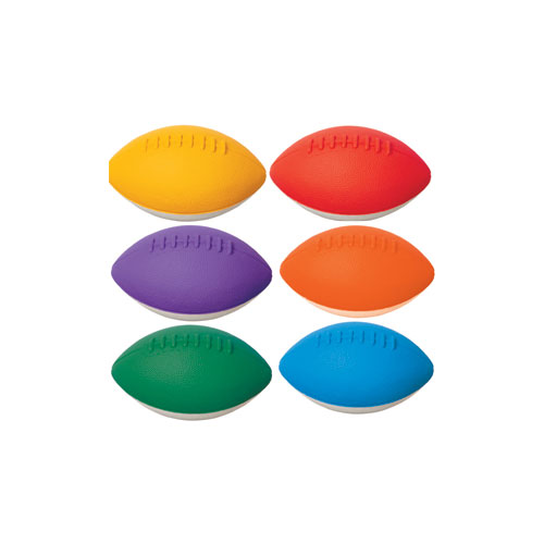 Set includes one Mini Foam Football in each of these colours; red, blue, green, purple, yellow and orange. Pewee Size 3.