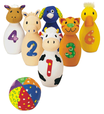 Baby Farm Bowling These farm animal bowling pins are fun to knock over. As they fall, they make different rattling sounds. Soft, squeezable, numbered and easy for tots to stand up. Comes with a weighted, chiming bowling ball. Grade: Toddler-1