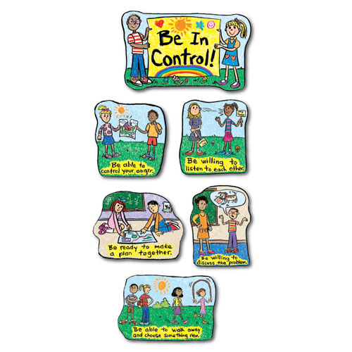 Encourage students to Be In Control of situations and their emotions with this colourful Bulletin Board Set. Eight illustrated cards show different conflict resolution scenes, the largest measuring approximately 13" x 13". Header, measuring 21" x 13" and resource guide are also included.