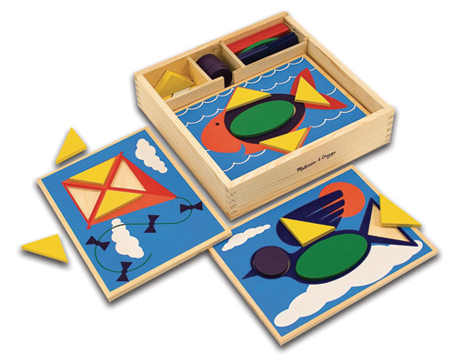 A perfect first manipulative! Five two-sided boards with ten recessed design templates are ready to fill with these brightly colored geometric shapes. Complete the pictures, or create your own designs and matching activities. Everything stores neatly in the sturdy wooden storage box. - Delivery Time 1-2 weeks