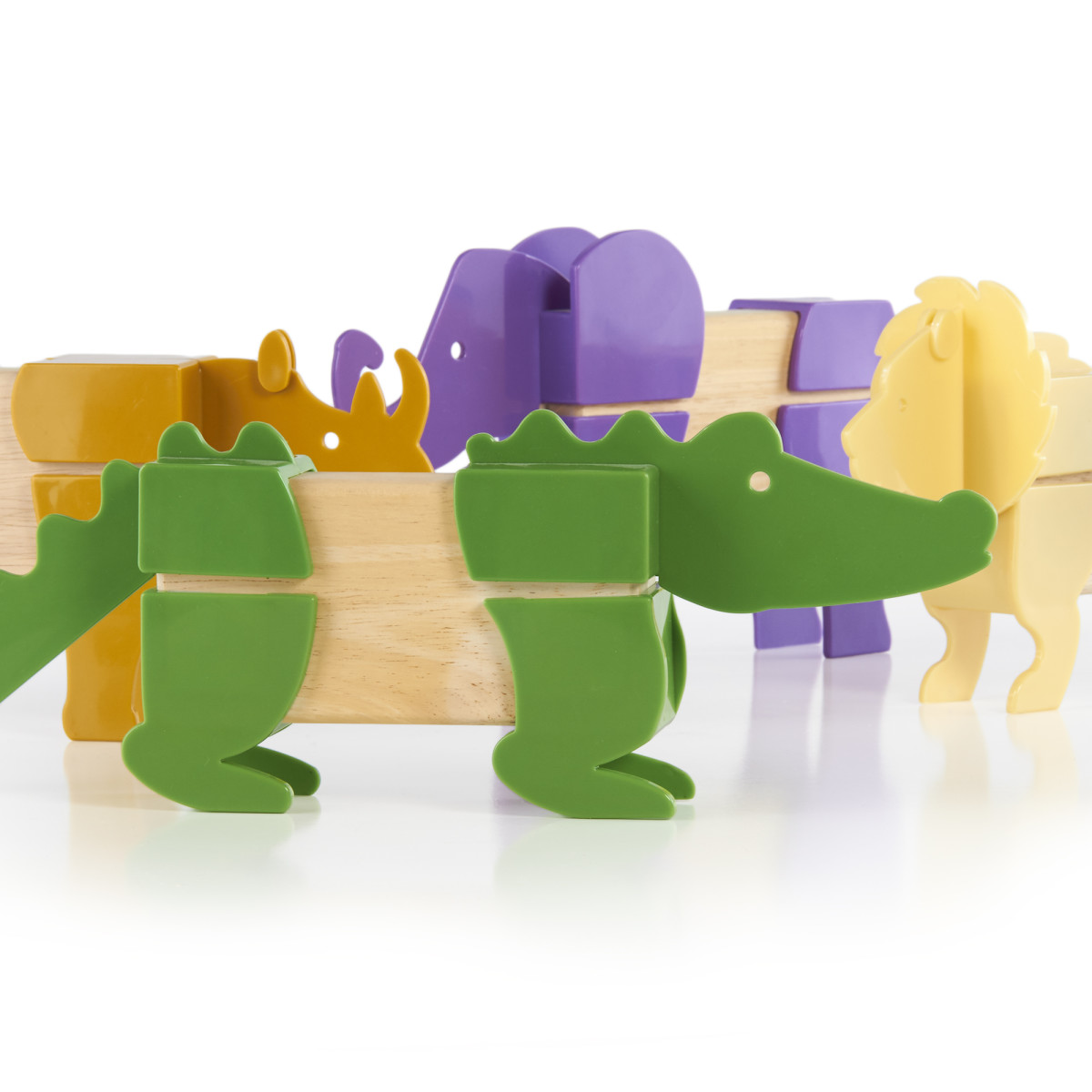 Building upon the wonderful foundation of unit blocks by providing children with a themed exploration set, Block Mates are designed to enhance the original principles of block-building. They are engineered to fit in standard unit blocks and can be built in their natural form or mixed and matched with others in the set to create new, imaginative vehicles or creatures. Our patented gasket design ensures a snug fit. Blocks not included. Set features five familiar safari animals: rhino, elephant, gorilla, alligator and lion. Ages 3+.