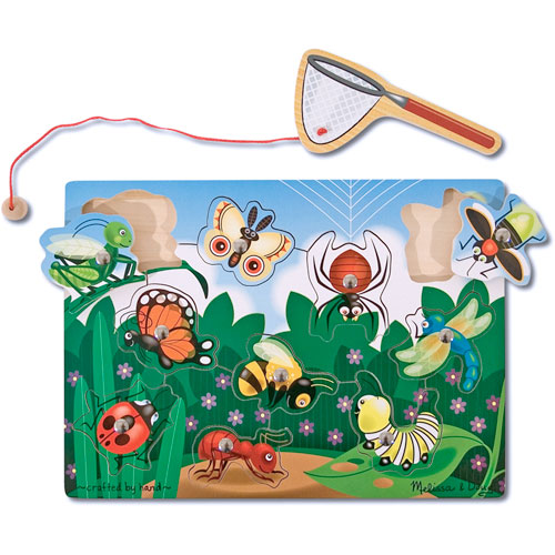 Has your bug catching expedition been rained out? The Magnetic Bug Catching Puzzle Game is the next best thing! Kids age 3+ can hunt for colourful bugs in a lush garden. Use the special magnetic bug net to capture great specimens. Once all of the colourful bugs have been found and removed from the puzzle board, kids can puzzle them back into their correct spots and play again. This unique game from Melissa and Doug encourages children to use their hand-eye coordination and visual perception skills.