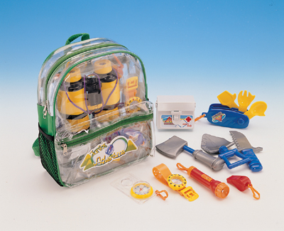 Everything a junior adventurer needs including binoculars, first aid box, knife, spade, axe, swiss army knife, whistle, flashlight, compass with magnifying glass and wrist compass. Comes in a see-thru backpack. Flashlight requires 1 "AA" battery (not included). Ages 3+.