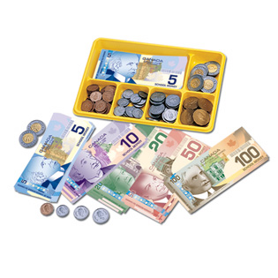 Canadian Currency-X-Change™ Activity Set Ages 5-11 Children will have loads of fun with this set of quality play money. Contains 110 plastic coins, 100 play money bills, sturdy six-sectioned plastic tray and bilingual Activity Guide.