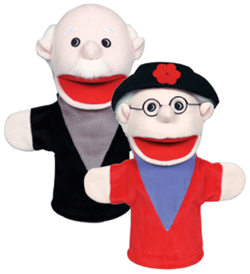 Bring stories to life with these bigmouth family puppets. Great fun, plus they help develop language and communication skills. Embroidered eyes and features are soft and safe. Durable fabrics are surface-washable. 12" size comfortably fits little or big hands. Set of four ethnic family members and grandparents too.