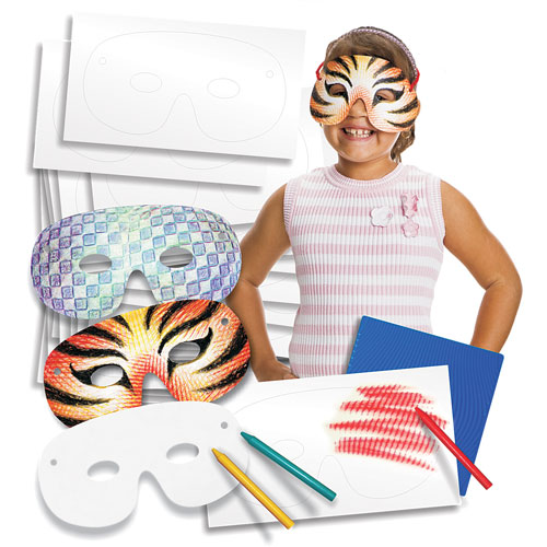 Easily decorate die-cut masks before punching them out of the backer paper. Make them special with rubbing plates, crayons, markers and paint. Pop them out and thread two pipe cleaners (not included) through the ear holes. Great for all ages!
