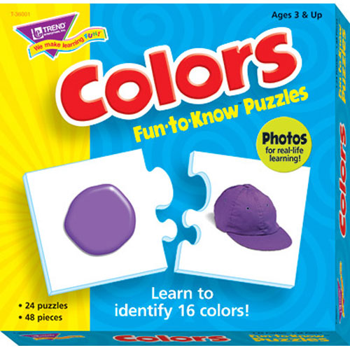 Bright photos of familiar objects help young learners identify 16 colours. Format adapts to abilities and features interlocking pieces with photographs for easy recognition and retention. 24 puzzles/48 pieces. Sturdy, durable pieces with self-checking design. Ages 3+