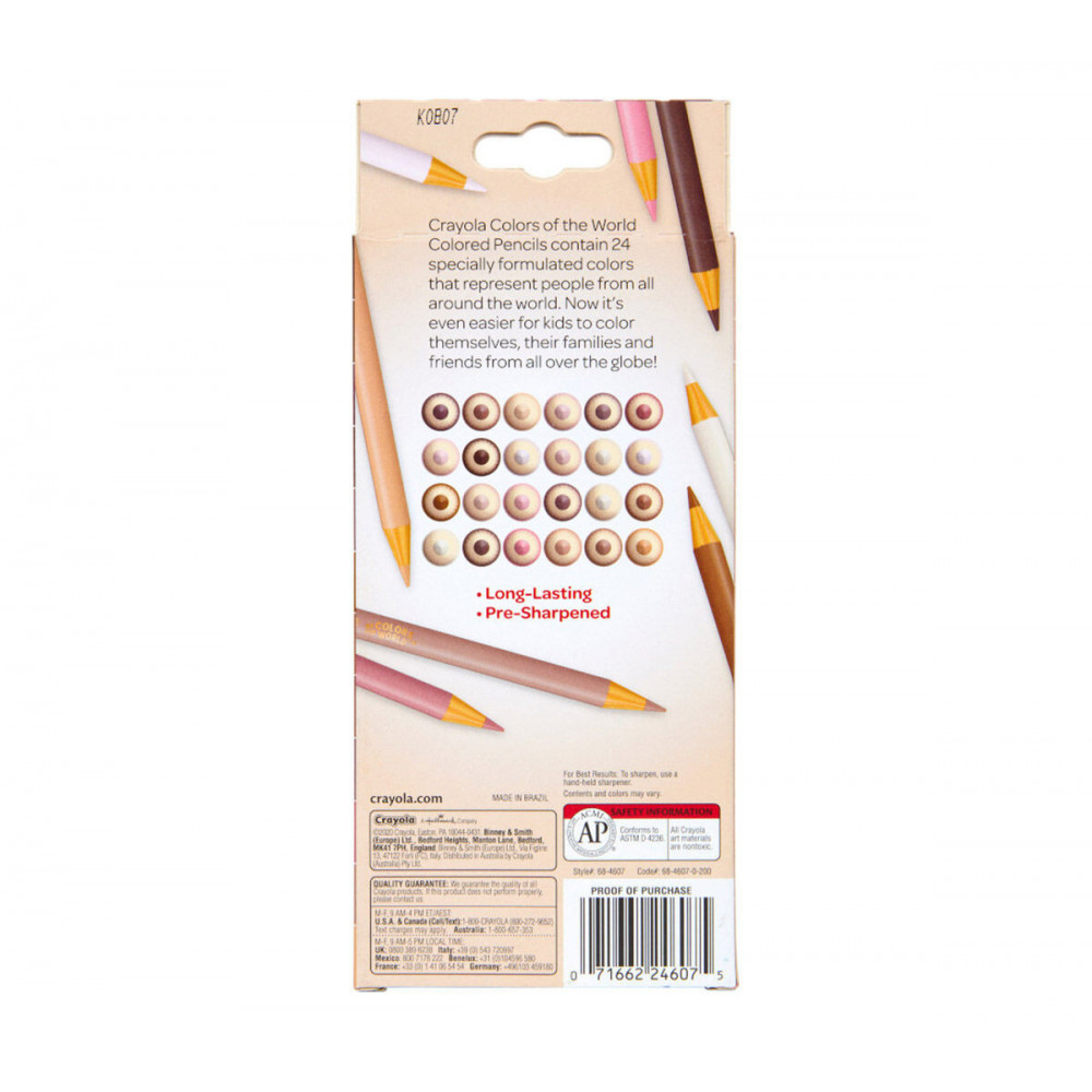 Includes 24 coloured pencils in a variety of skin tone colours that represent people from around the world. Safe and nontoxic. 24 pieces. Ages 5 and up.