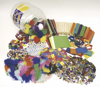 A tremendous assortment of popular craft items in a durable, reusable storage container. Includes feathers, pom pons, chenille stems, wiggle eyes, buttons, dough cutters, modeling clay, glitter poms, jumbo craft sticks, WonderFoam shapes and sheets, sequins & spangles, pony beads & rainbow cord and glitter glue pens.