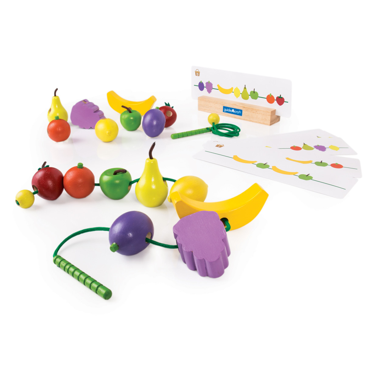 This Count and Lace Fruit set encourages children to lace the caterpillar threading needle through 8 colorful fruits to create many patterns.