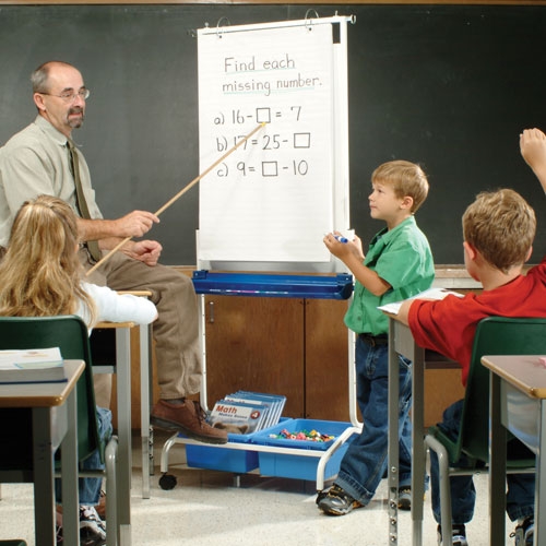 - Magnetic double-sided dry erase whiteboard with telescoping hooks to accommodate pocket charts up to 49” wide