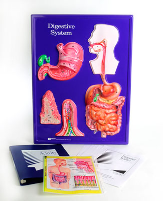 The digestive system is shown with details of the mouth, salivary glands, esophagus, stomach, liver, pancreas, and intestines. Learning is enhanced by the cutaway sections and enlargements of the stomach and intestine which further illustrate the system. Set includes a colorful 24"H X 18"W model and activity guide which includes overhead transparency, blackline master, and teacher developed activities. Grades: 3 - 12