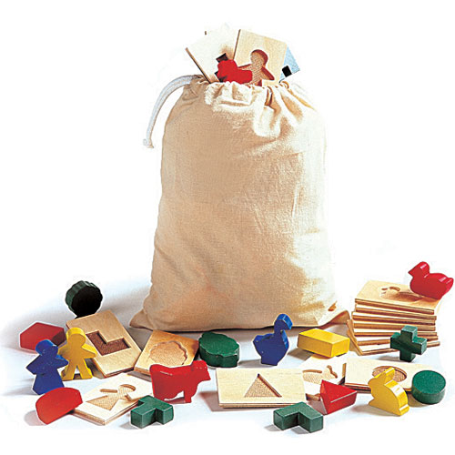 Contains 22 matching wooden shapes and printed tiles provided in a durable cloth bag. Children, parents and teachers will find an unlimited number of games in this bag. Deal out the tiles and have children reach into the bag to find the corresponding wooden shape. Children can play alone or in a larger groups. A great visual and tactile exercise. Ages 3 to 7 years.
