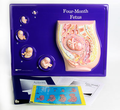 The Four-Month Fetus Model is one of a series of models that comprise the Sex Education and Family Living coordinated program. This model features life-sized, detailed, and accurate representation of the anatomical features of the fetus and its mother. The sequence on the model illustrates the successive development of the fetus from the sixth week after conception to the 16th week.
