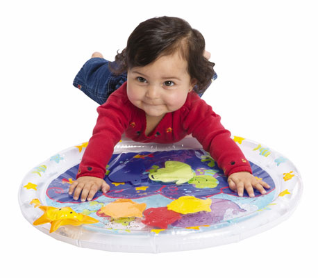 Fill and Fun Water Play Mat Fill the inflatable edge mat with tap water for tactile and visual fun. Includes 5 water pals to push and try to grab. 11.5"x5.5"x2". Ages 6 months and up. Grade: infant