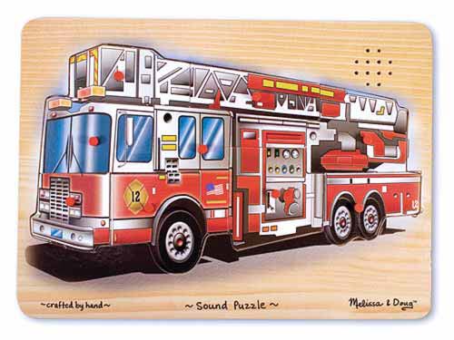 The shiny red fire engine on this wooden peg puzzle makes fire engine sounds, when all nine pieces are correctly placed in the puzzle board! Full-color, matching picture under each piece.