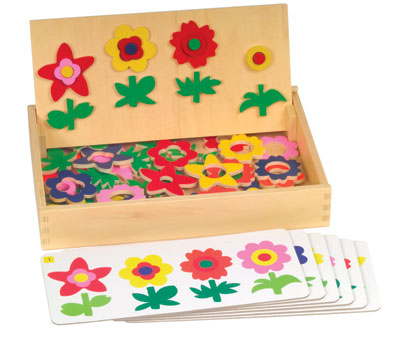 Match flower petals and stems using the easy-to-follow laminated pattern guides. Self-propping board with pegs and magnetic elements. Wood storage case doubles as game board/play area.