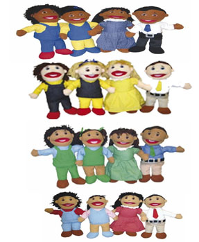 These fantastic puppet families are perfect for role-playing, storytelling and exploring family issues. All puppets have easy to manipulate "talking" mouths, yarn hair, contemporary outfits and happy, embroidered facial features. Surface washable. Parents are 38cm (15") and children are 33cm (13") tall. Set of 4 Families