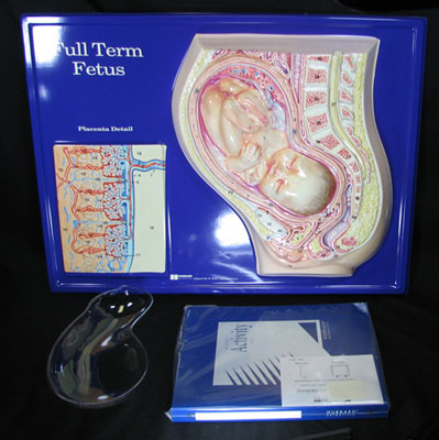The Full-Term Fetus Model is one in a series of human anatomy models that make up a coordinated program in Sex Education/Family Living. The model is derived from anatomical sources. Dimensions and spatial relationships are anatomically accurate. The model shows a full-term fetus positioned within the maternal body. A removable transparent plastic shell illustrates the amnion ("bag of water") in which the fetus rests. The model also contains a detailed enlargement of the placenta in semi-diagrammatic form. The enclosed key provides proper nomenclature to each of the parts of the model. In addition to the model which provides both visual and tactile experience to the learner, black line drawings are provided for visual reinforcement (black line master included) to each learner for study purposes. For improved reinforcement, the model may be used together with transparencies from other models.