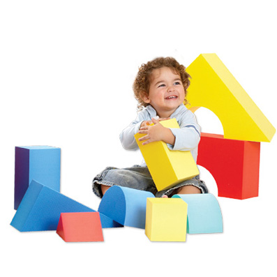 6 months & up. Bendable, twistable, stackable blocks made of soft materials make construction sites safer, encourage creative play, and keep blocks from being damaged if children pull or bend them. Each set includes a variety of shapes and sizes (all 3.5" thick) and comes in an assortment of red, blue, yellow, and green.