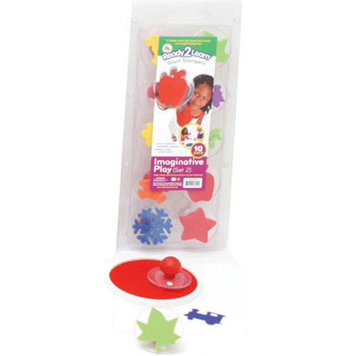 Ready2Lean Giant Stampers are perfect for creating posters, signs and more! Giant Stampers from Center Enterprises can be used with either paint or ink to create quality impressions, each and every time. Each stamp is 3" in diameter and is mounted on a clear top, which takes the guesswork out of perfect placement. Stamps also features directional arrows and a label showing the image being stamped. Giant Stampers also have 'comfort grip' handles suitable for both adult and child size hands. Handles are colour coded by set to make sorting and clean up easier. Each set of Giant Stampers comes packaged in a convenient clear plastic storage case. The creative possibilities are virtually endless with Ready2Learn Giant Stampers.