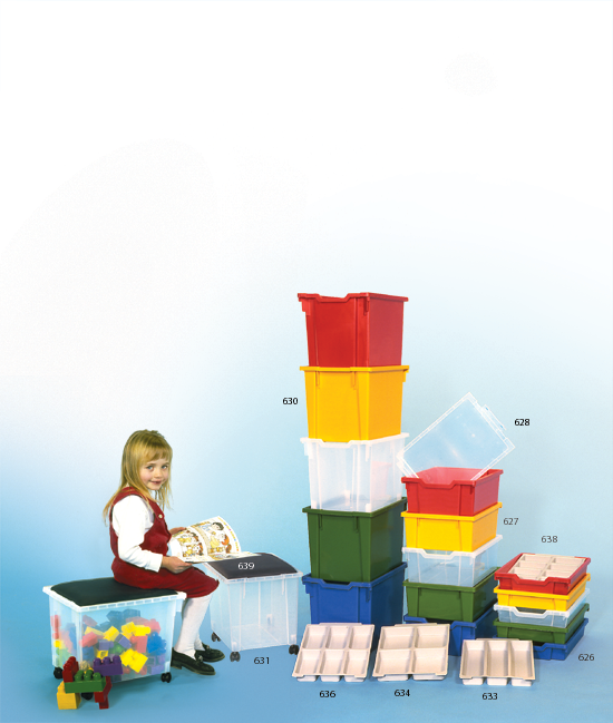 Gratnell Bins 6 Section Insert These award-winning bins are built and designed to withstand heavy-duty classroom use. Add divided inserts and clip-on lids to bins for specific sorted storage. Bins come in red, blue, yellow, green, and clear.