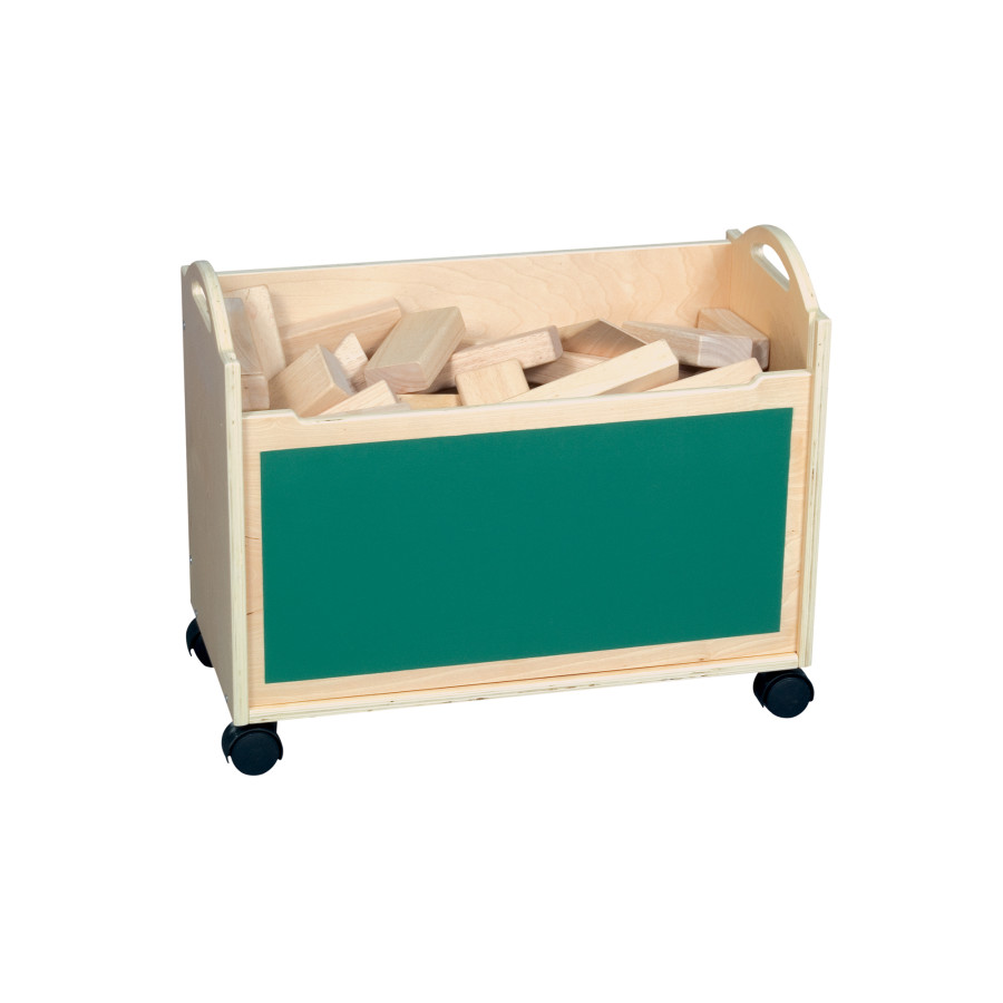 Our block cart features heavy-duty casters, a sliding front panel for easy storage and unloading, and a chalkboard front panel for incorporating writing or drawing into creative block play. Solid birch plywood construction with a tough UV coating. Adult assembly required. Ages 3+. 24″W x 14″D x 17″H