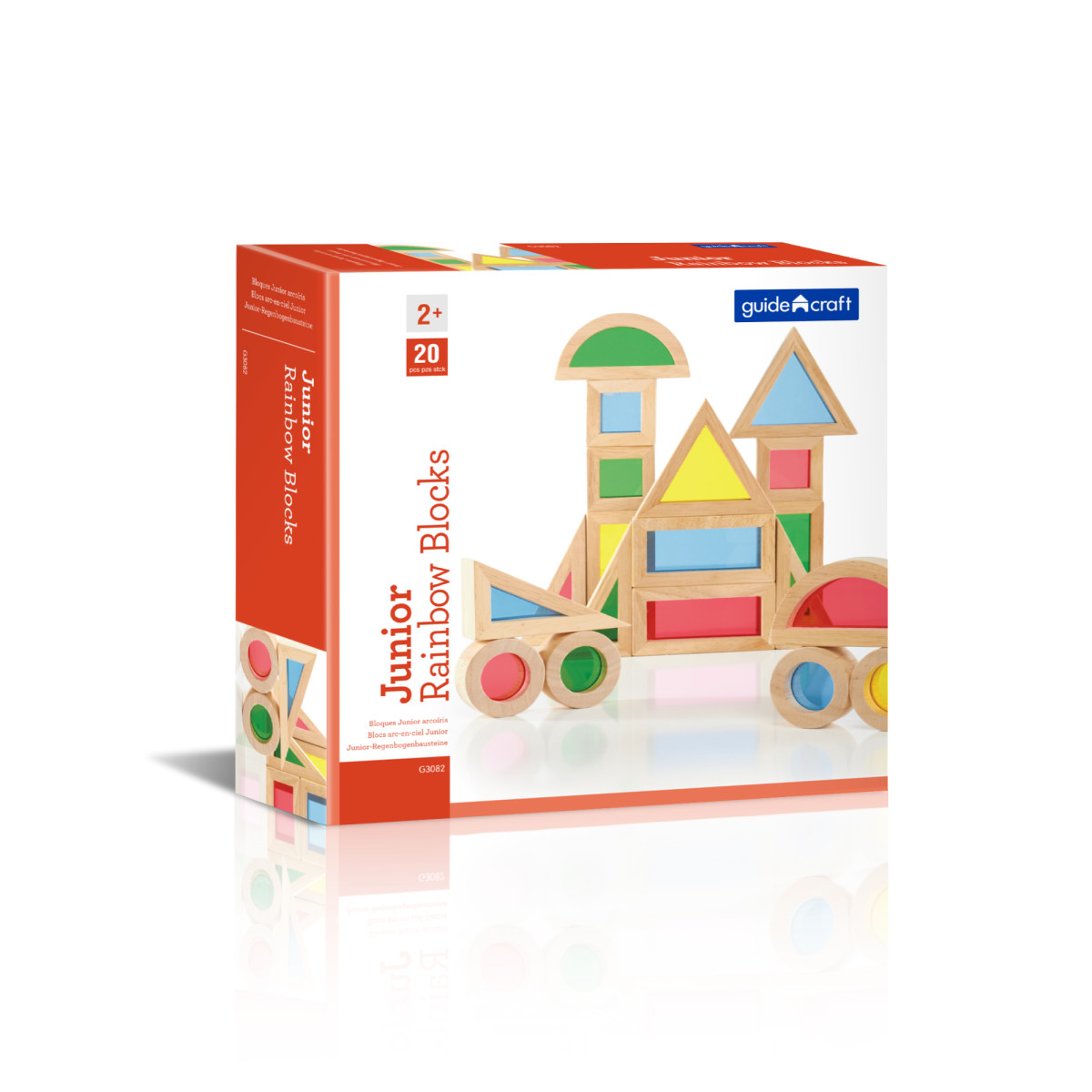 An adventure in color and light! One-third smaller than unit block size, Jr. Rainbow Blocks are a new challenge in creating structures and extending traditional block play. Smooth hardwood frames with inset, colorful, transparent acrylic windows are also ideal for color exploration and light table activities. Ages 2+.