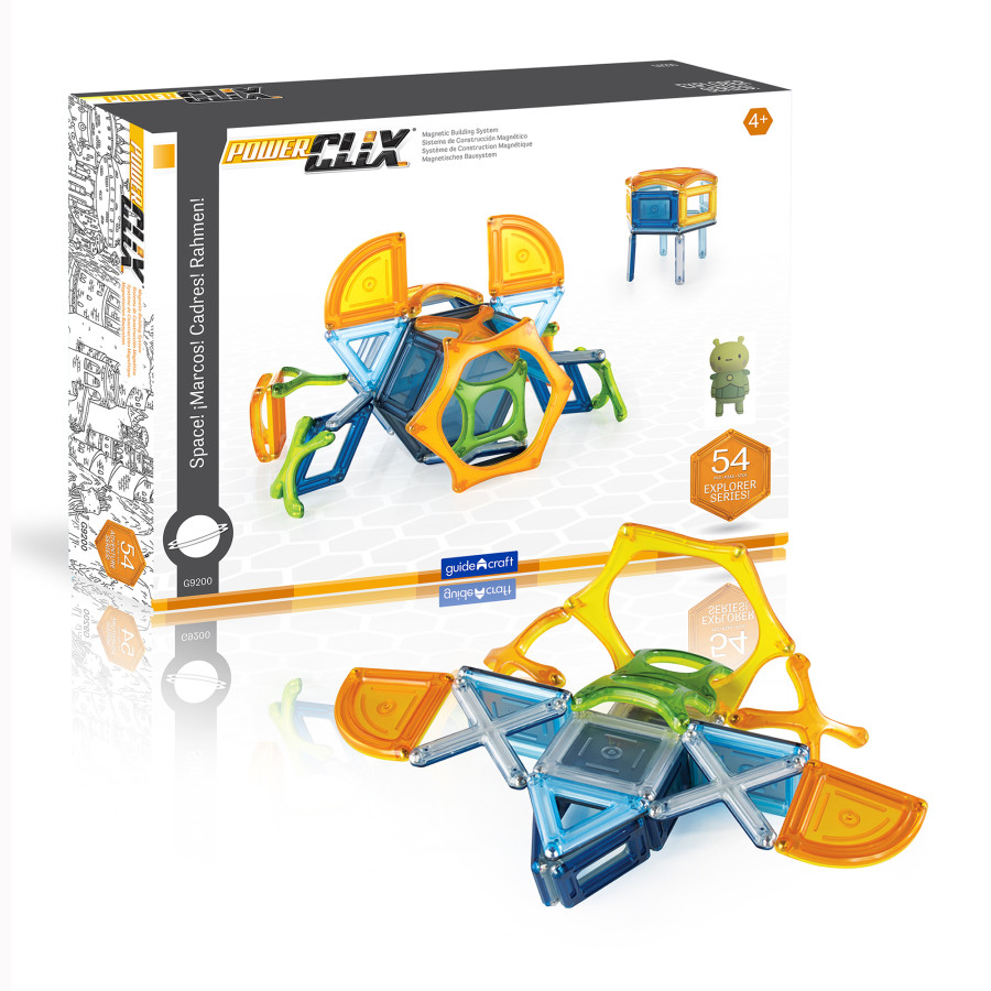 This exciting premier set of the NEW PowerClix® Explorer Series, combines 52 pieces of all three PowerClix® design languages, Frames, Solids and Organics, for the first time. The new series is designed to encourage multiple STEM skill development while sparking a child’s imagination and creativity. The build guide includes an original illustrated comic, interactive backdrop and space figure for dramatic play. All artwork and storyline created by talented 16 year-old artist, Ethan Wadsworth. Children will explore the universe with Space Guy and his friend, commandeering spaceships and fighting evil aliens they have created themselves. Suggested Age: 5